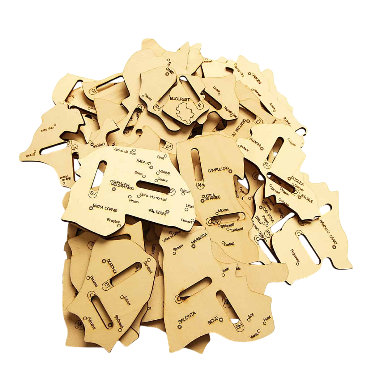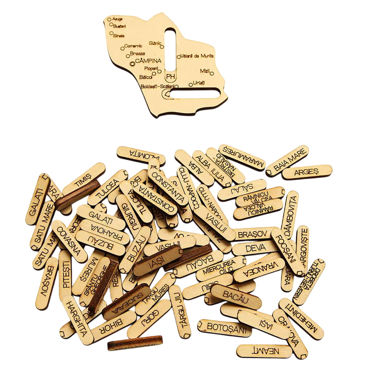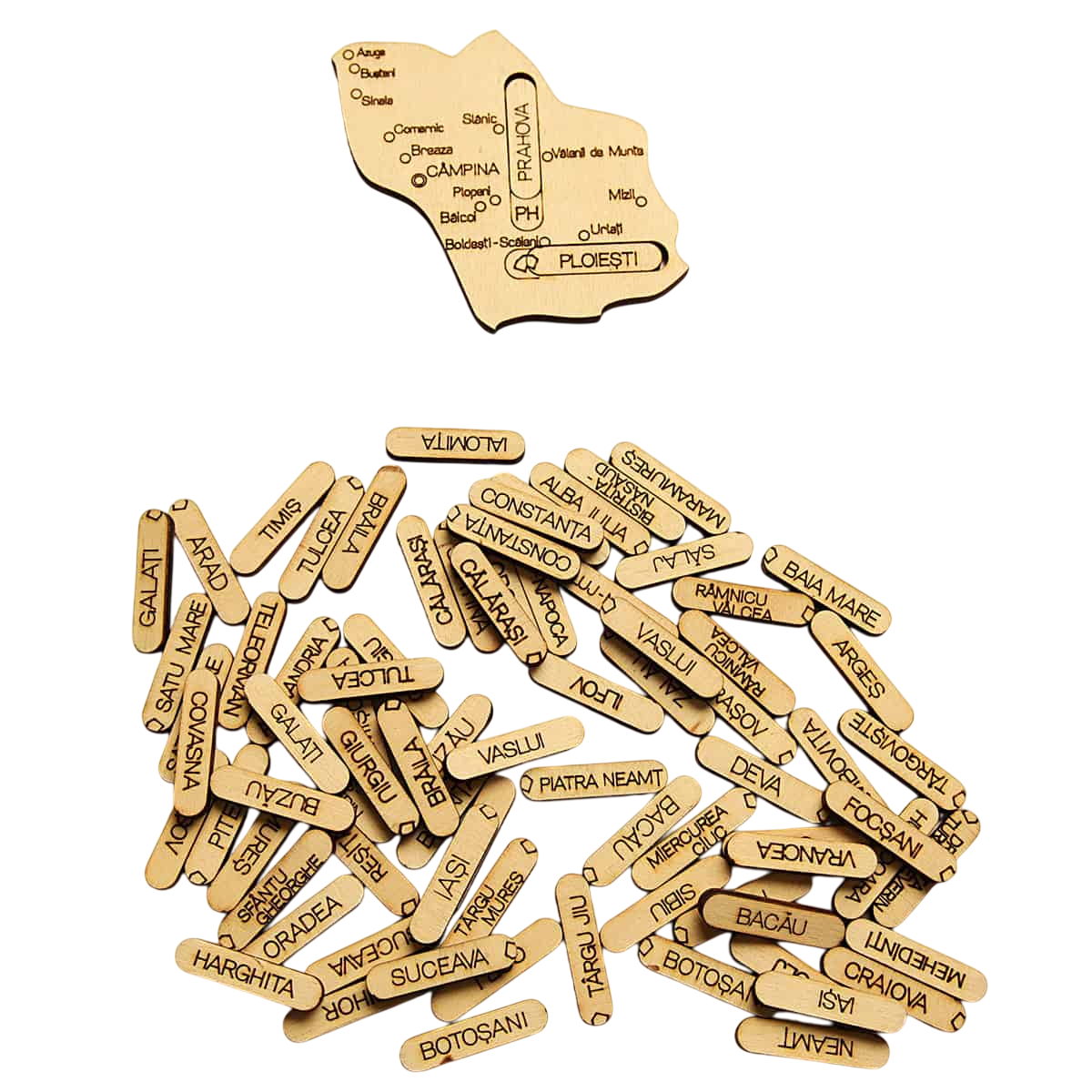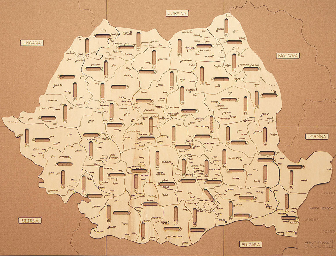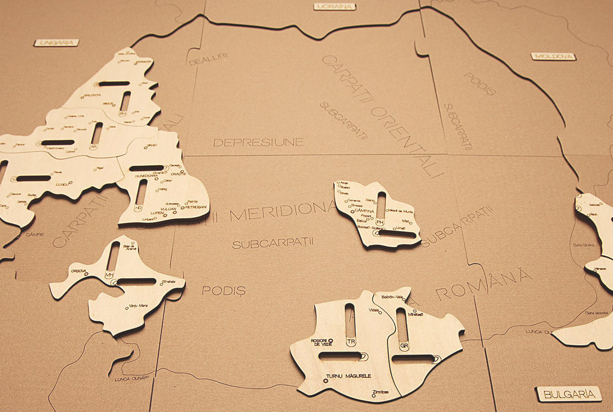Piese lemn: 41 de piese unice cu numele orașelor de reședință; 41 de piese unice cu numele județelor, 41 de piese unice din lemn stratificat în forma județelor României, pe care sunt gravate toate orașele din județe, indicativul județului și piesele cu vecinii României;